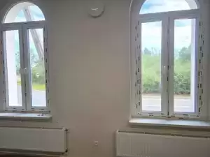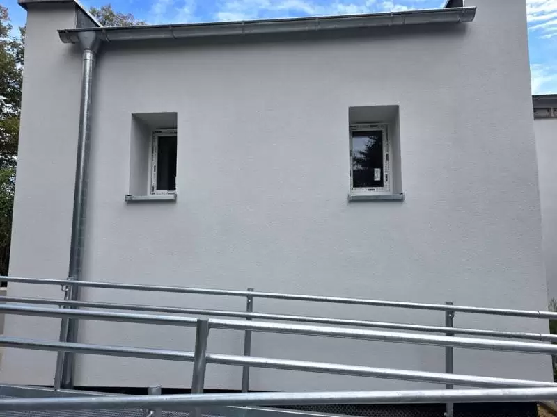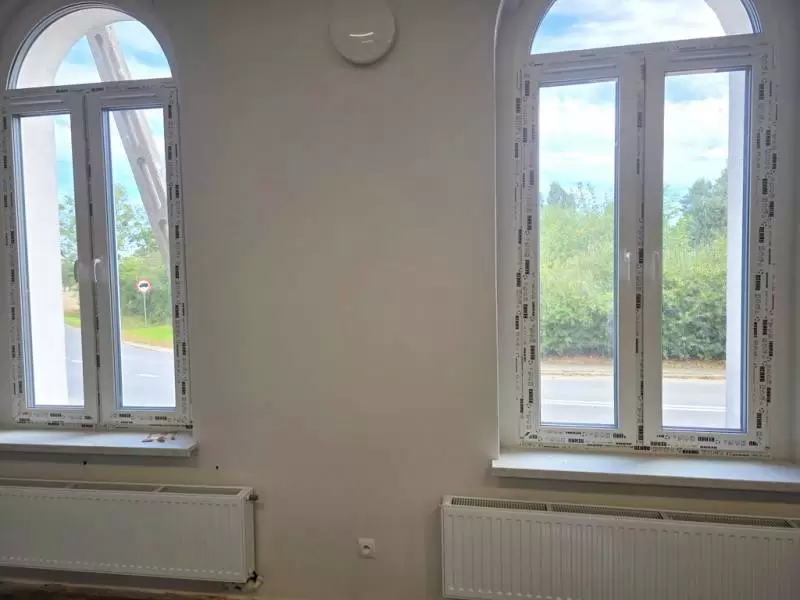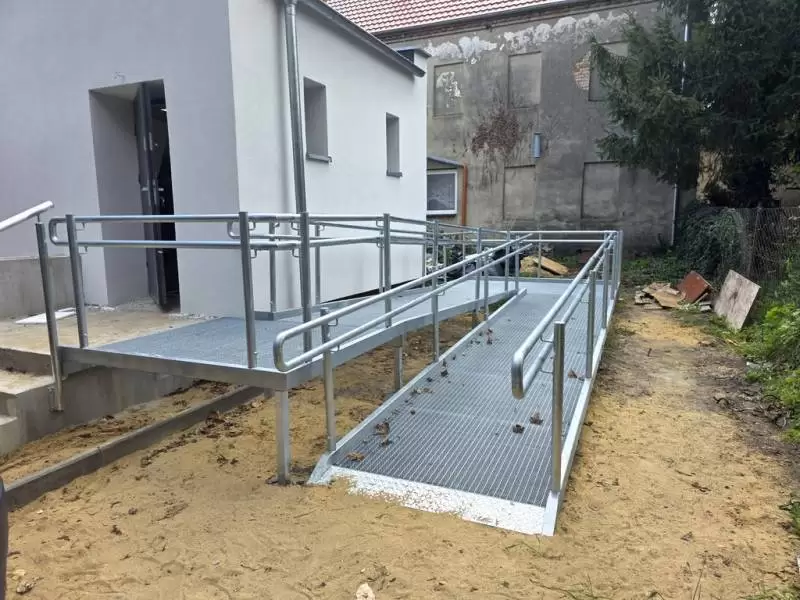 Wewnątrz trwają już ostatnie prace wykończeniowe. Zamontowano pochylnie, zakończono montaż stolarki okiennej i drzwiowej, a obecnie instalowana jest pompa ciepła i grzejniki.