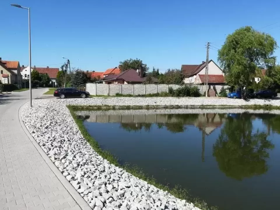 W ramach zadania o wartości 45 600 zł odpompowano wodę ze zbiornika, oczyszczono go z nagromadzonego osadu dennego i umocniono górną część skarpy granitowym narzutem kamiennym rozłożonym na geowłókninie.
