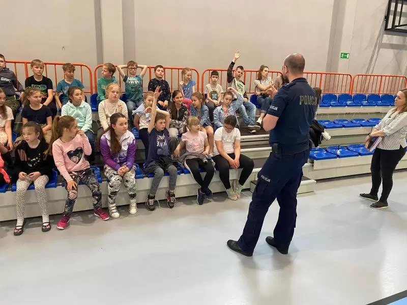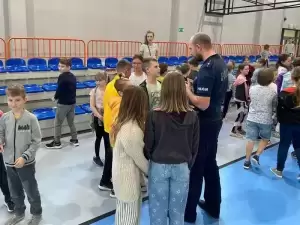 Dzieci wysłuchały pogadanki na temat bezpiecznego poruszania się pod drodze. Policjanci wykorzystali do tego prezentację multimedialną wyświetloną na terenie hali sportowej przedstawiającą różne aspekty bezpieczeństwa począwszy od wyjścia z domu, drogę do szkoły, pobyt w szkole po aspekty bezpiecznej zabawy w czasie wolnym.