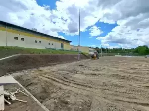 Trwa intensywna realizacja inwestycji związanej z budową nowoczesnego kompleksu sportowo-rekreacyjnego. Obecnie wykonywane są nawierzchnie parkingu i ciągów komunikacyjnych, formowane są skarpy oraz prowadzone humusowanie terenu. Równocześnie trwa wyrównywanie boiska i bieżni, które w kolejnym etapie zostaną pokryte sztuczną trawą oraz nawierzchnią poliuretanową.