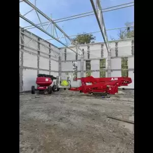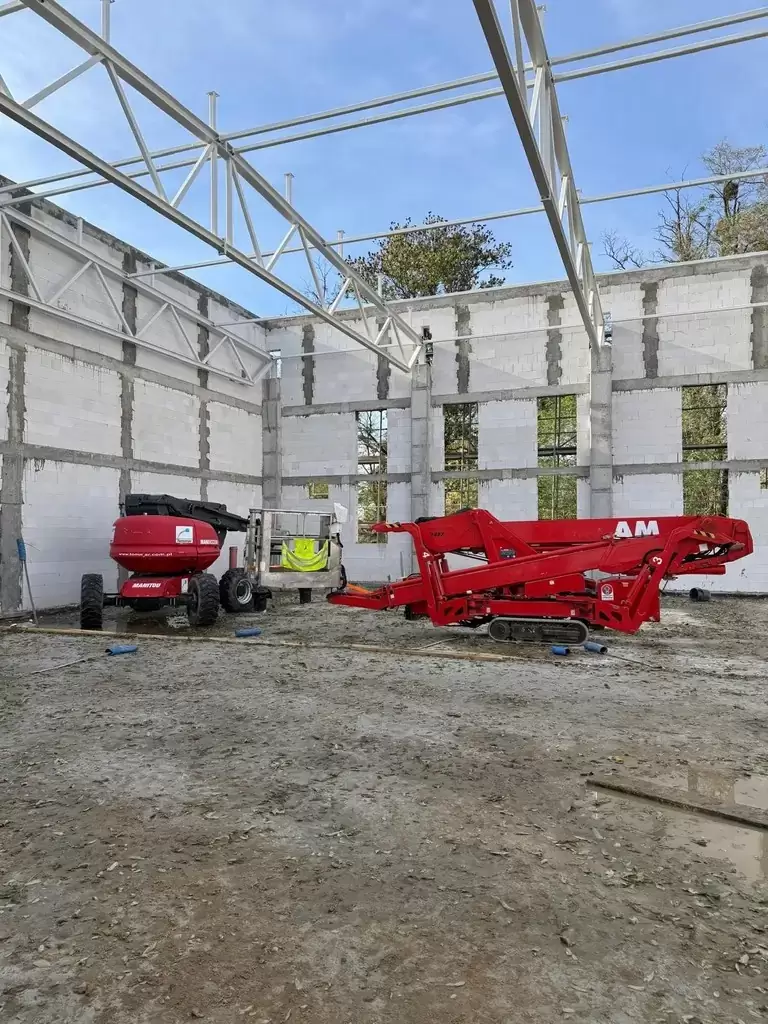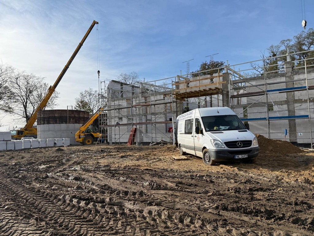 Trwają intensywne prace przy budowie zbiorników wody czystej i surowej. W budynku wykonano już instalacje podposadzkowe w części administracyjnej i technologicznej, a obecnie trwa wznoszenie ścian oraz montaż kratownicy pod konstrukcję dachu.