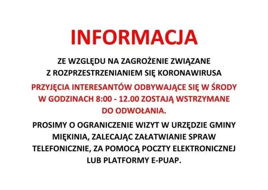 Ze względu na zagrożenie związane z rozprzestrzenianiem się koronawirusa, przyjęcia interesantów w Urzędzie Gminy Miękinia, odbywające się w środy w godzinach 8:00-12.00, zostają wstrzymane do odwołania.