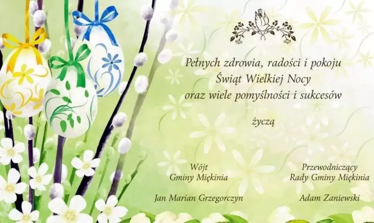 Pełnych zdrowia, radości i pokoju Świąt Wielkiej Nocy oraz wiele pomyślności i sukcesów życzą Wójt Gminy Miękinia Jan Marian Grzegorczyn i Przewodniczący Rady Gminy Miękinia Adam Zaniewski.