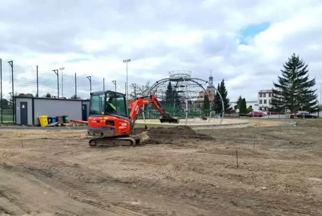 Obecnie prowadzone są prace nad wykonaniem bieżni. Wewnątrz budynku szatni sportowej trwają instalacje sanitarne oraz prace elewacyjne.