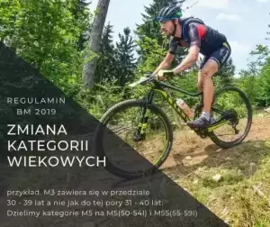 W tym roku czekają na Was duże zmiany w BIKE MARATON. Będziemy się ścigać na dystansie FUN , na dystansie CLASSIC, MEGA i oczywiście na GIGA. Zmienią się też godziny startów: dystans GIGA ruszy na trasę już o 10:00. MEGA i CLASSIC wystartują o 11:00, a FUN o 11:30.Jeśli chodzi o kategorie wiekowe, to również trochę je przesunięto. Przykładowa kategoria M3 lub K3, która do tej pory zawierała się w przedziale 31 – 40 lat, zmieści się w tym roku w przedziale 30 – 39. Wzorem kategorii 60 +, podzielono również na pół (z wyłączeniem GIGA) dekadę pięćdziesięciolatków. Będzie zatem kategoria M5 (50 – 54) i M55 (55-59).