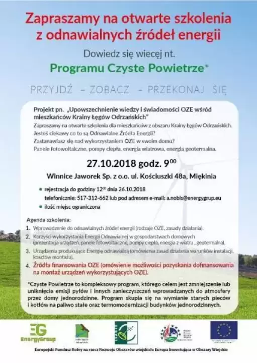 Dowiedz się więcej na temat Programu Czyste Powietrze. Zapraszamy 27.10.2018 r. o godz. 9:00 do Winnic Jaworek w Miękini.