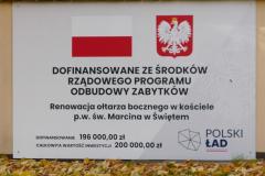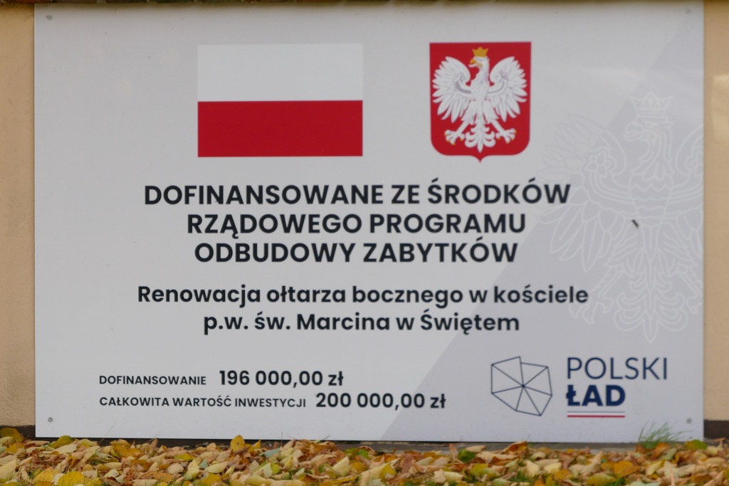 We wtorek 28 bm. komisja odbiorcza dokonała odbioru końcowego zadania pn. “Renowacja ołtarza bocznego w kościele św. Marcina w Świętem”. Wartość tego zadania to 200 tys. zł (dofinansowanie: 196 tys. zł, wkład Powiatu: 4 tys. zł). Bardzo udaną konserwację techniczną oraz estetyczną ołtarza przeprowadził konserwator Marcin Furykiewicz.