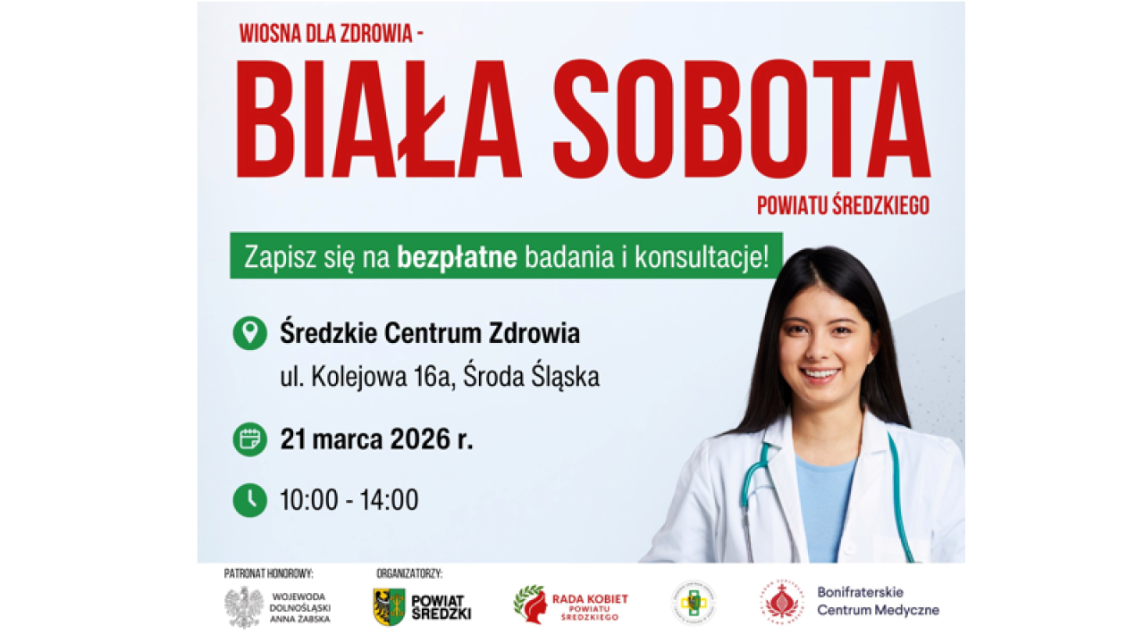 W pierwszy dzień wiosny, 21 marca w godzinach 10:00–14:00 zapraszamy Was na wydarzenie „Wiosna dla Zdrowia – Biała Sobota Powiatu Średzkiego” pod Patronatem Honorowym Wojewody Dolnośląskiej Anny Żabskiej.