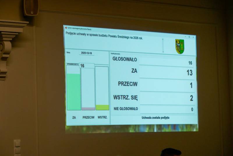 13 głosami za, 1 przeciw i 2 wstrzymujących się przyjęto na wczorajszej sesji uchwałę budżetową Powiatu Średzkiego na rok 2026.