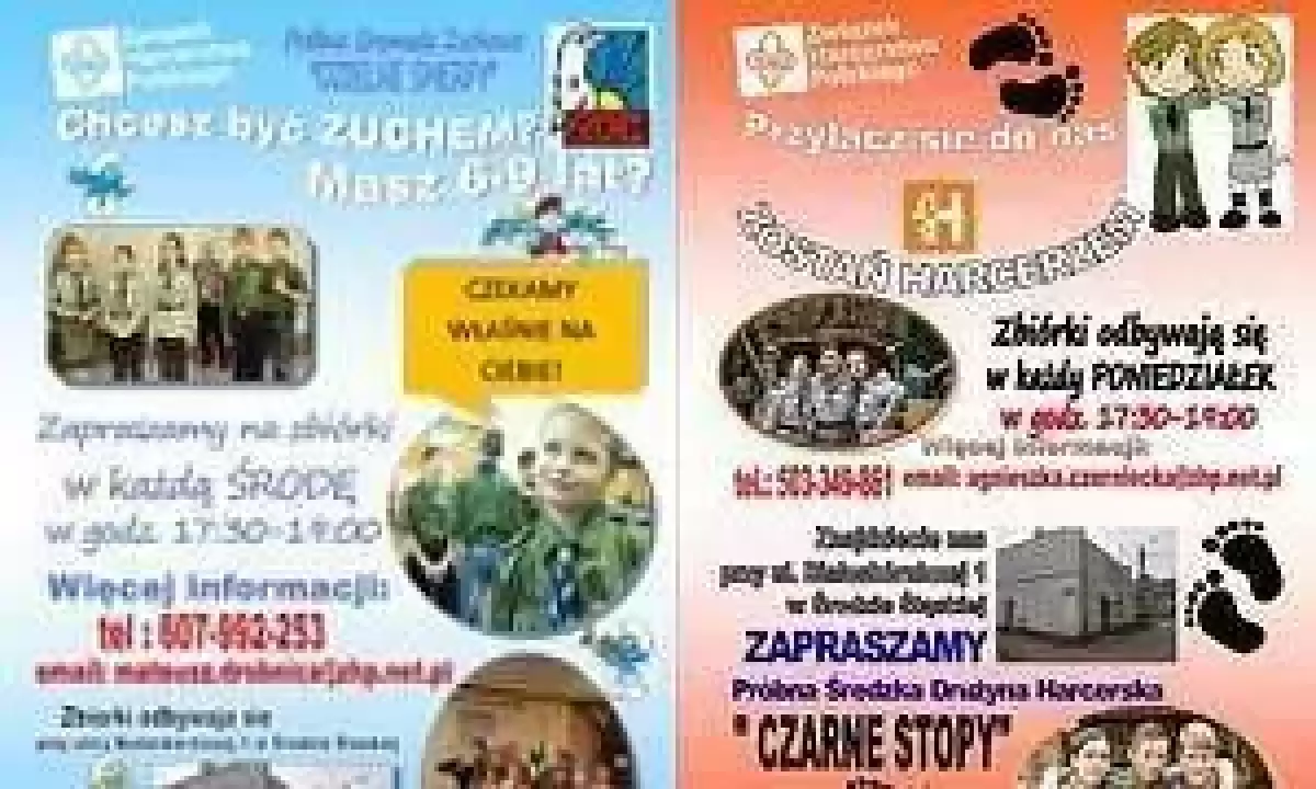 Średzki hufiec Związku Harcerstwa Polskiego zaprasza dzieci i młodzież do udziału w zbiórkach Próbnej Gromady Zuchowej "Dzielne Smerfy" i Próbnej Średzkiej Drużyny Harcerskiej "Czarne stopy".