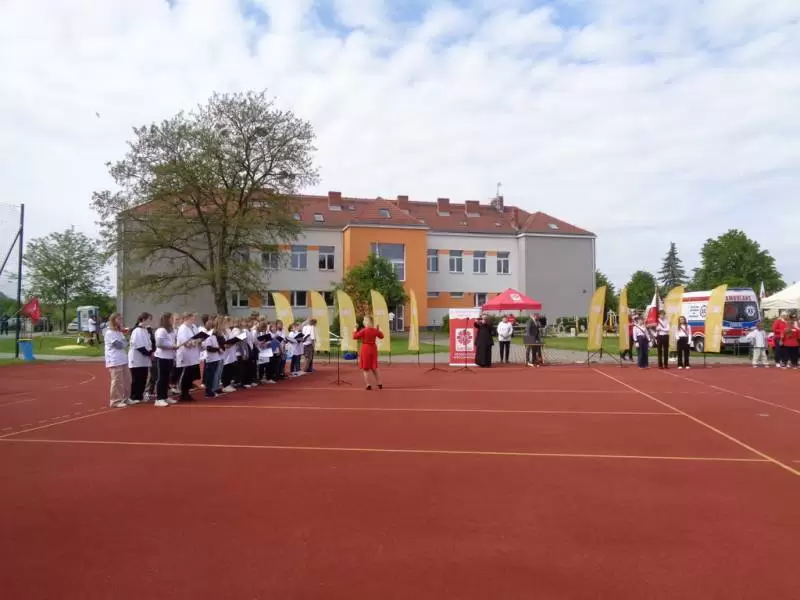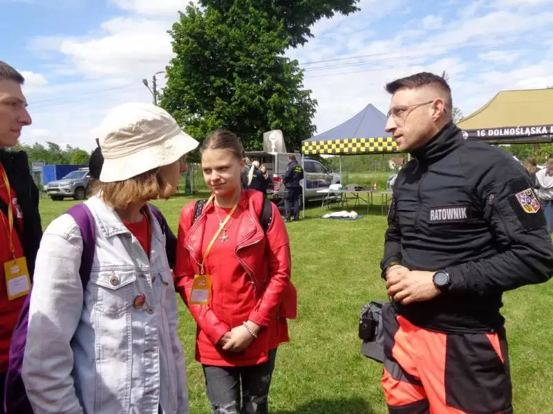 Po części oficjalnej wzięliśmy udział w warsztatach prowadzonych przez Straż Leśną, Straż Miejską, Straż Pożarną, Antyterrorystów, Pogotowie Ratunkowe, Wojska Obrony Terytorialnej oraz wolontariuszy – sanitariuszy ze Schroniska Brata Alberta we Wrocławiu. Nasi uczniowie mogli pogłaskać koniki straży miejskiej z Wrocławia, obejrzeć broń ręczną antyterrorystów, zapoznali się z zagadnieniami ochrony środowiska leśnego oraz zostali przeszkoleni z obsługi defibrylatora i udzielania pierwszej pomocy przedmedycznej. Zostaliśmy też ugoszczeni pyszną kawą, ciastami i owocami, przygotowanymi przez tutejsze Koło Gospodyń Wiejskich oraz kiełbaskami z grilla upieczonymi przez członków Caritas. Mieliśmy okazję spotkać się z innymi wolontariuszami oraz wymienić nasze doświadczenia z działalności kół noszących dobro, miłość bliźniego i pomoc potrzebującym.