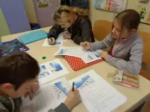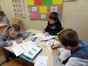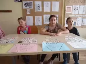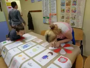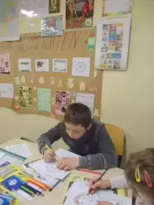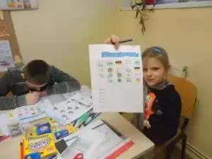 Współpracowaliśmy z Internatem naszej placówki, zapraszając dzieci oraz wychowawców na uroczystość naszej koleżanki. Nie zabrakło zabawy konstruktywnej – graliśmy w gry edukacyjne/ Wie geht’s?, Die Welt der Tiere, Die Planet stert auf dem Spiel/. Uczniowie podczas zabawy zapoznali się z różnymi metodami dbania o środowisko, pojęciem ekologii , zagadnieniami ochrony przyrody oraz opieki nad zwierzętami. Uczciliśmy również stulecie odzyskania niepodległości Polski, tworząc plakat i uroczyste laurki. Poznaliśmy również mnóstwo piosenek, wierszy, przysłów, idiomów w języku naszych zachodnich sąsiadów. W zajęciach prowadzonych przez Ewę Ek udział wzięli: Emilia, Kinga, Dawid, Norbert , Wiktor i goście z naszej szkoły. Każde spotkanie było digitalizowane, powstał nawet album fotograficzny z najciekawszymi zdjęciami naszych zajęć językowych.