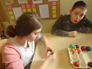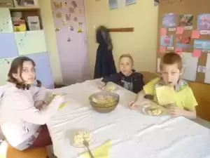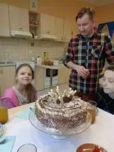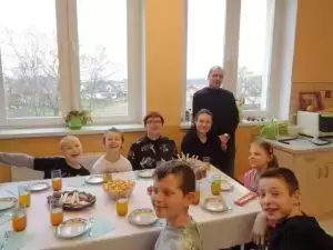 Mieliśmy zajęcia kulinarne – razem z panią technolog Mariolą Majewską przygotowaliśmy niemiecką sałatkę ziemniaczaną, koktajle owocowe, tort urodzinowy Kingi oraz piekliśmy ciasto na zakończenie cyklu spotkań. Uczniowie uczyli się nakrywać stoły, poznawali formy, ozdoby i dekorację jadalni na różne okoliczności. Przy okazji powtarzając słownictwo związane z produktami spożywczymi, recepturą w obcym języku. Zapraszaliśmy również gości do współpracy. Razem z panem Pawłem Wenderskim, podopieczni przygotowali prezenty na święta dla rodziców i dziadków.