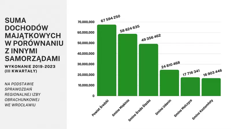 Według przedstawionych danych całą kadencję 2018-2023 można zaliczyć do niezwykle udanych. Potwierdzeniem tego są łączne wpływy do budżetu, które wyniosły ponad 67 mln zł i były wyższe od wpływów gmin (Miękinia 58 mln zł, Środa Śląska 49 mln zł, Udanin 24 mln zł, Malczyce 17 mln zł i Kostomłoty 16 mln zł). Wartości przedstawione w prezentacji pobrano ze sprawozdań kwartalnych Regionalnej Izby Obrachunkowej we Wrocławiu.