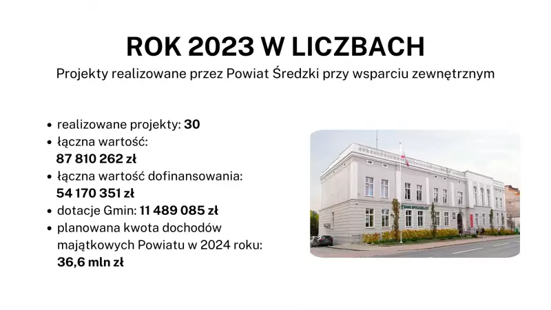 W 2023 roku Powiat realizował 30 projektów na łączną kwotę 87,8 mln zł i dofinansowaniu wynoszącym 54 mln zł. Te dane, osiągnięte dzięki współpracy z Gminami, zapewniły mu pierwsze miejsce wśród lokalnych samorządów pod względem wielkości pozyskanych i rozliczonych środków zewnętrznych w pierwszych trzech kwartałach 2023 r. W analogicznym zestawieniu obejmującym dolnośląskie powiaty nasz samorząd zajął drugie miejsce.