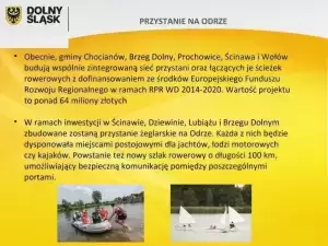 Przedstawiciele organizacji pozarządowych składający, bądź chcący składać swoje wnioski w ramach w/w konkursów, zwracali uwagę, na braki odpowiedniej infrastruktury związanej z rzeką, uniemożliwiające w dużej części realizację wielu zadań. Stąd potrzeba realizacji programu Dolnośląski Fundusz Odrzański. Warto podkreślić, że obecnie, gminy Chocianów, Brzeg Dolny, Prochowice, Ścinawa i Wołów budują wspólnie zintegrowaną sieć przystani oraz łączących je ścieżek rowerowych z dofinansowaniem ze środków Europejskiego Funduszu Rozwoju Regionalnego w ramach Regionalnego Programu Operacyjnego Województwa Dolnośląskiego 2014-2020. W ramach inwestycji w Ścinawie, Dziewinie, Lubiążu i Brzegu Dolnym zbudowane zostaną pasażerskie przystanie żeglarskie na Odrze. Każda z nich będzie dysponowała miejscami postojowymi dla jachtów, łodzi motorowych czy kajaków. Powstanie też nowy szlak rowerowy o długości 100 km, umożliwiający bezpieczną komunikację pomiędzy poszczególnymi portami.