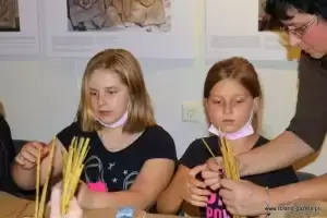 Po części teoretycznej wszyscy uczestnicy wzięli udział w “dziadowskiej uczcie”. Były gorące pyzy, ciasto z kaszy gryczanej, racuchy, a do popicia zsiadłe mleko, kawa zbożowa i kwas chlebowy. Olga Saganowska poprowadziła warsztaty tworzenia chochoła ze słomy.