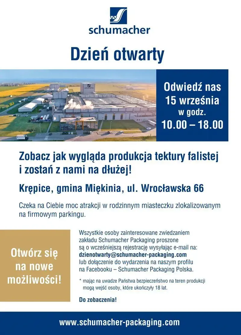 Zobacz jak wygląda produkcja tektury falistej i zostań z nami na dłużej! Zapraszamy 15 września br. w godz.: 10.00-18.00 do Krępic w gminie Miękinia przy ul. Wrocławskiej 66.