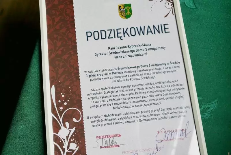 W minionym tygodniu jubileusze powstania obchodziła powiatowa jednostka - Środowiskowy Dom Samopomocy w Środzie Śląskiej z filią w Piersnie. 13 listopada odbyła się uroczystość w Piersnie (19 lat działalności), a dzień później w Środzie Śląskiej (21 lat).