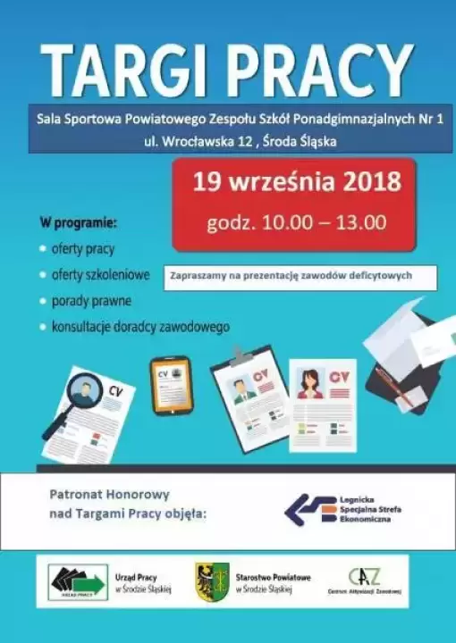 Starostwo Powiatowe oraz Powiatowy Urząd Pracy w Środzie Śląskiej zapraszają na Powiatowe Targi Pracy, które odbędą się 19 września w sali sportowej Powiatowego Zespołu Szkół Ponadgimnazjalnych nr 1 w Środzie Śląskiej przy ul. Wrocławskiej 12.