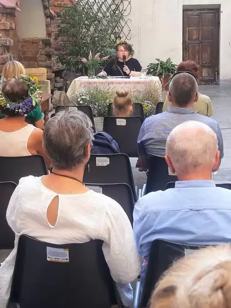 “Noc Kupały” rozpoczęła się od krótkiego wykładu, w trakcie którego adiunkt muzealny Anna Celuch wyjaśniła pochodzenie tej nazwy i przybliżyła tradycje nocy świętojańskiej. Opowiedziała o istotnej roli wody i ognia w ludowych obrzędach, a także o mitycznym kwiecie paproci. Aby łatwiej przyswoić dużą ilość wiedzy, w trakcie wykładu miały miejsce przerywniki muzyczne. Klimatyczne piosenki prezentowała Ania Staranowicz z Wrocławia.