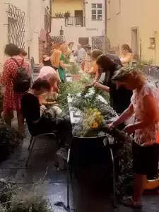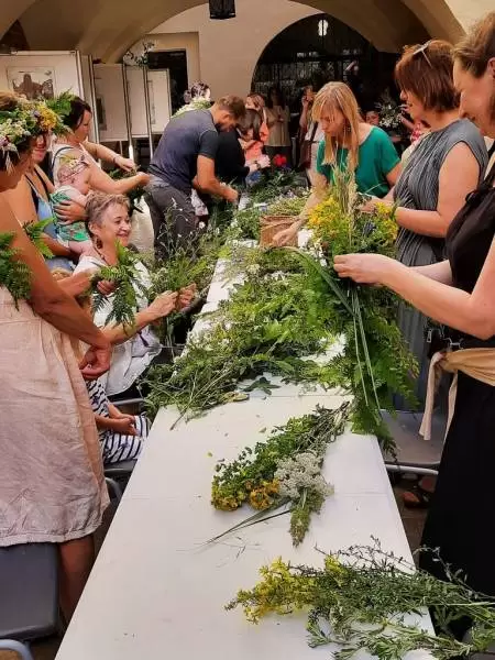 Dużym zainteresowaniem cieszyły się tematyczne warsztaty z plecenia wianków. Kwiaty do nich dobrane były nieprzypadkowo - postawiono na te, które pojawiały się w tradycyjnych ozdobach świętojańskich, m.in. bylicę, dziurawca czy lubczyk. Następnie nadszedł czas na wróżby. Panny stawały tyłem do drzewa i trzykrotnie rzucały wiankiem za siebie. Jeżeli za pierwszym razem zawisł na gałęziach znaczyło to, że wyjdą za mąż w ciągu roku, jeśli za drugim - w ciągu dwóch lat i analogicznie za trzecim - w ciągu trzech lat. Natomiast jeżeli kobieta nie trafiła w drzewko miałoby to oznaczać, że zostanie starą panną. W przypadku osób zamężnych zmieniały się jedynie intencje rzutu.
