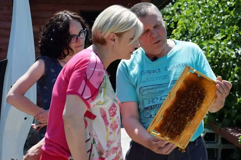 Z samego rana ekipa nagraniowa odwiedziła państwa Ziębów w Lipnicy. Tam pan Zenon Zięba z synem Bartłomiejem opowiedzieli o pasiece oraz w kilku ujęciach zaprezentowali swoje pszczoły. Dużym zainteresowaniem dziennikarki cieszyły się dwa niedawno wybudowane domki do uloterapii.