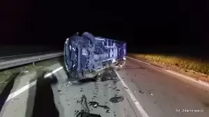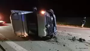 Wskutek zderzenia samochód wjechał w bariery energochłonne, ostatecznie przewracając się na pasie jezdni.