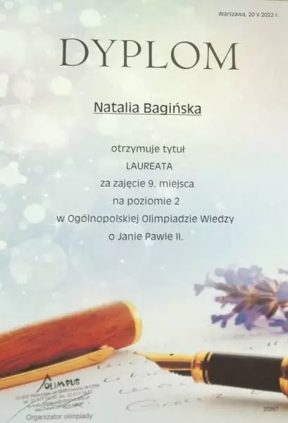 24 czerwca w Specjalnym Ośrodku Szkolno-Wychowawczym im. Janusza Korczaka w Środzie Śląskiej, podczas uroczystego apelu kończącego rok szkolny 2021/2022, uhonorowano uczniów uczestniczących w Ogólnopolskiej Olimpiadzie Wiedzy o Janie Pawle II - Olimpus 2022.