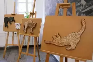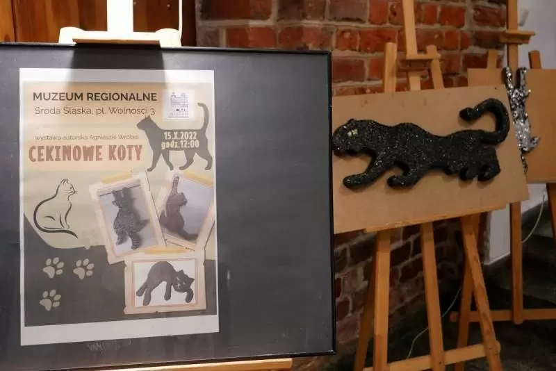 Z kolei w holu muzeum prezentowane są "Cekinowe koty", autorstwa Agnieszki Wróbel. Pani Agnieszka jest osobą niewidomą, jednak nie przeszkadza jej to w tworzeniu wyjątkowych dzieł.