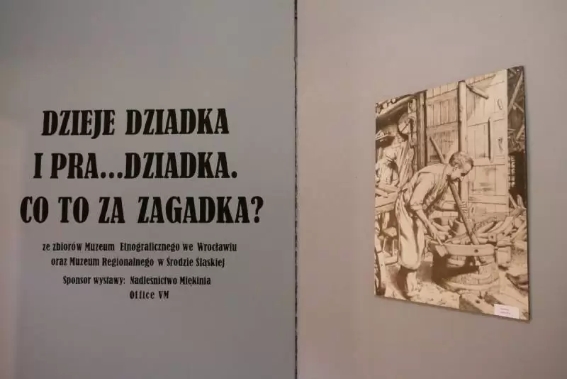 Na wystawie "Dzieje dziadka i pra...dziadka. Co to za zagadka?" znajdziemy przedmioty używane powszechnie przez naszych przodków, które zostały zastąpione nowocześniejszymi rozwiązaniami. Zwiedzający mają za zadanie odgadnąć jak nazywają się prezentowane rzeczy i do czego służyły. W rozwiązywaniu zagadek pomoże katalog wystawowy. Eksponaty na wystawie pochodzą ze zbiorów Muzeum Etnograficznego we Wrocławiu oraz naszej placówki i są to m.in. chomąto, wyciskarka do buraków, kołowrotek, żelazko na żar, krajalnica do tytoniu, mikrofon, lokalówka, piesek do butów oraz światłomierz.