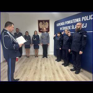 W obecności Komendanta Powiatowego Policji w Środzie Śląskiej mł. insp. Artura Dobrowolskiego, I Zastępcy Komendanta Powiatowego Policji podinsp. Marcina Wodzińskiego, przedstawicieli kadry kierowniczej oraz zgromadzonych rodzin, nowo przyjęci policjanci uroczyście wypowiedzieli słowa roty ślubowania, zobowiązując się do sumiennego i rzetelnego wykonywania swoich obowiązków na rzecz społeczeństwa.