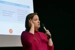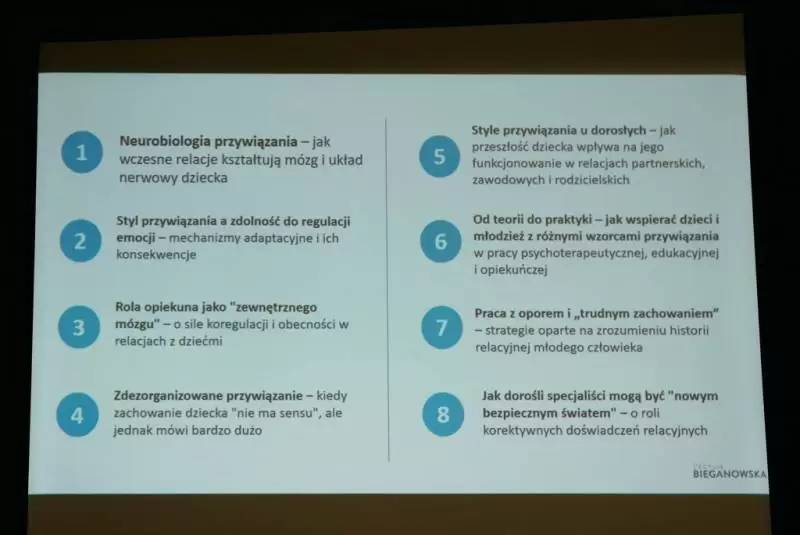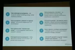 Następnie głos zabrała Cecylia Bieganowska - psychoterapeutka, która w sposób niezwykle interesujący omówiła zagadnienia takie jak: neurobiologia przywiązania, wpływ wczesnych relacji na rozwój mózgu i układu nerwowego, style przywiązania i ich znaczenie w kontekście regulacji emocji, rola opiekuna jako „zewnętrznego mózgu”, style przywiązania w dorosłości. Prowadząca odpowiadała również na pytania zebranych dzieląc się z nimi swoim cennym doświadczeniem.