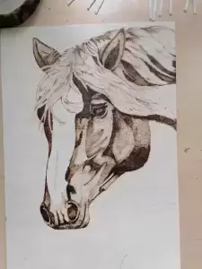 Na taką technikę “malowania” natknęła się na Facabooku, na jednej z grup poświęconej koniom. Bardzo spodobała jej się podkładka pod kubek z wypalonym rumakiem. Postanowiła dowiedzieć się z czym się to wszystko wiąże i bardzo ją to wciągnęło. W pani Eli już od gimnazjum tkwiła artystyczna dusza, zajmowała się wtedy szkicowaniem sylwetek koni, więc zaczynając swoją przygodę z pirografią nie była zupełnym laikiem. Mimo to, jak sama mówi, wciąż się uczy. Aby obraz wyszedł dobrze należy poświęcić mu bardzo wiele godzin ciężkiej pracy, jeden zły ruch pirografem i cała praca na marne.