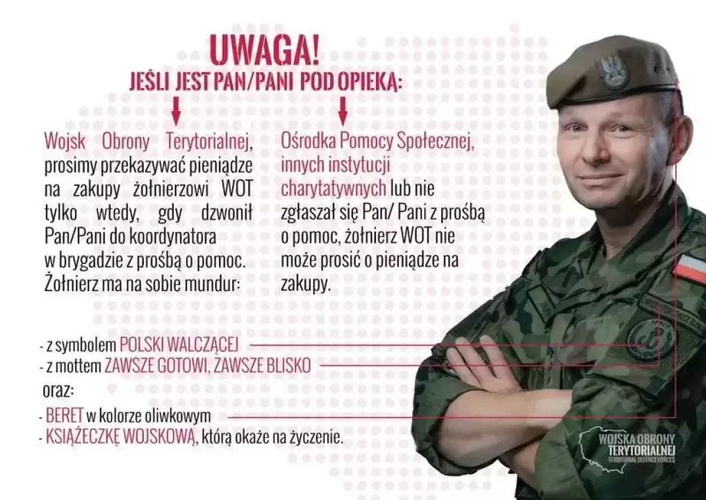 Przypominamy, że żołnierze 16 Dolnośląskiej Brygady Obrony Terytorialnej wykonujący zadania w ramach przeciwdziałania pandemii koronawirusa, w tym wsparcia kombatantów i osób starszych wyróżniają się następującymi detalami: na lewym ramieniu oznaka „Polski Walczącej” wraz z mottem „Zawsze gotowi, zawsze blisko”; oliwkowy beret; mundur żołnierza Wojska Polskiego. Tożsamość żołnierzy 16 DBOT można również potwierdzić książeczką wojskową z nazwiskiem i zdjęciem żołnierza.