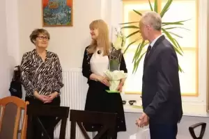Starosta Powiatu Średzkiego Krzysztof Szałankiewicz oraz dyrektorka Powiatowego Zespołu Placówek Oświatowych Małgorzata Czerwiec wraz z pracownikami pożegnali dzisiaj odchodzącą na zasłużoną emeryturę Marię Bystrzanowską.