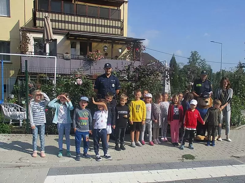 Dzieci otrzymały od funkcjonariuszy elementy odblaskowe, plany lekcji a także pozowały do wspólnego zdjęcia z maskotką policyjną - Komisarzem Lwem.