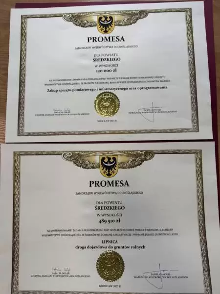 Pierwsza z nich zakłada zakup nowoczesnego sprzętu pomiarowego i informatycznego, na co przeznaczono kwotę 120 000 zł. Druga inwestycja dotyczy realizacji pierwszego etapu budowy drogi dojazdowej do gruntów rolnych na trasie Lipnica – Środa Śląska, która zostanie dofinansowana kwotą 489 000 zł.