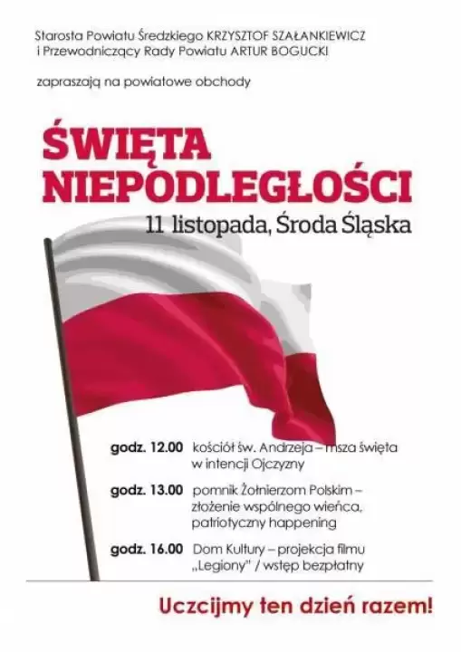 Starosta Powiatu Średzkiego Krzysztof Szałankiewicz i Przewodniczący Rady Powiatu Artur Bogucki zapraszają na powiatowe obchody Święta Niepodległości!