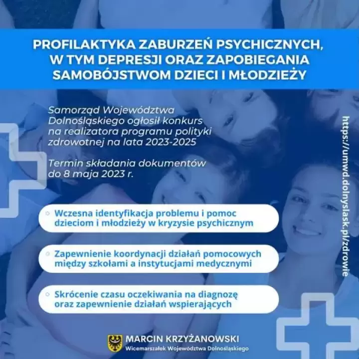 Samorząd Województwa Dolnośląskiego ogłosił konkurs na realizatora programu polityki zdrowotnej na lata 2023-2025. Program dotyczy profilaktyki zaburzeń psychicznych, w tym depresji oraz zapobiegania samobójstwom dzieci i młodzieży. Budżet programu to 3,3 mln zł na lata 2023-2025. Programem objęte zostanie minimum 20 tys. dzieci i młodzieży z Województwa Dolnośląskiego w wieku 10-19 lat.