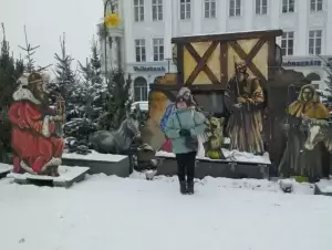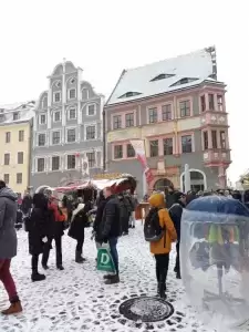 Görlitz powitało nas śnieżną aurą, ale temperatura powietrza była na tyle niska, że mróz nam nie dokuczał. Ulicą Berlińską udaliśmy się do zabytkowego centrum, po drodze obserwując piękne kamieniczki, wieże: Reichenbacherturm, Keisertrutz, Wołów i Najświętszej Marii Panny. Przy pięknym i ciekawym architektonicznie Domu towarowym zrobiliśmy sesję zdjęciową. Na placu Mariackim zauważyliśmy szopkę z Trzema Królami oraz stoiska z lokalnymi smakołykami.
