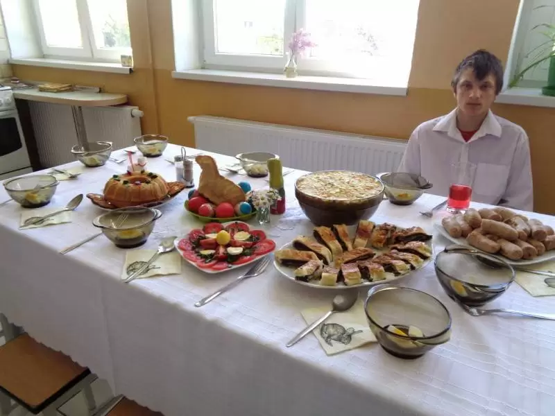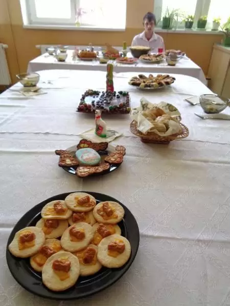 Na odświętnie udekorowanych stołach nie zabrakło tradycyjnych wielkanocnych specjałów: wielkanocnego baranka, kraszanek, żurku z białą kiełbasą, zapiekanych parówek na kruchym cieście, sałatek warzywnych oraz słodkości - kajmakowego mazurka, lukrowanej babki wielkanocnej, makowca na cieście francuskim, czekoladowych zajączków, cukrowych baranków, ciasteczek zdobionych lukrem, glazurą i czekoladą. Wszystkie potrawy przygotowali członkowie koła pod czujnym okiem opiekunów - pani Ewy i pana Pawła.