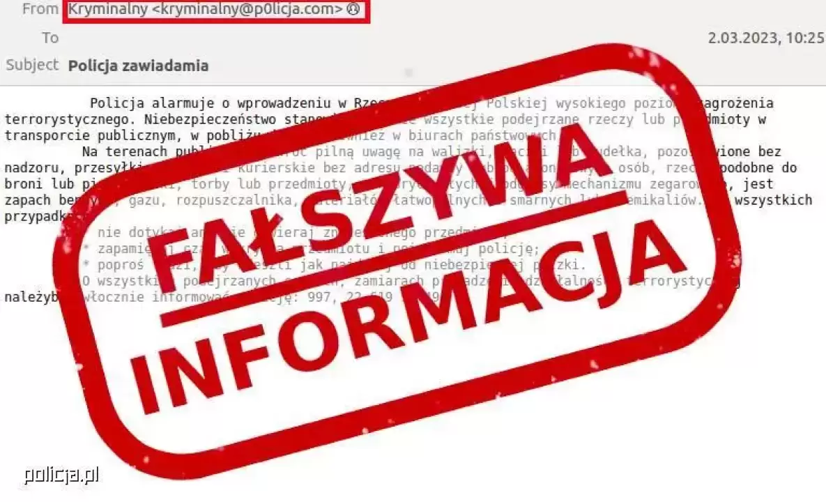 W ostatnich dniach obserwujemy kolejne próby podszywania się pod Policję. Do wielu osób rozsyłana jest wiadomość e-mailowa pochodząca rzekomo od Policji, z treści której możemy dowiedzieć się o istniejącym wysokim poziomie zagrożenia terrorystycznego na terenie Polski.