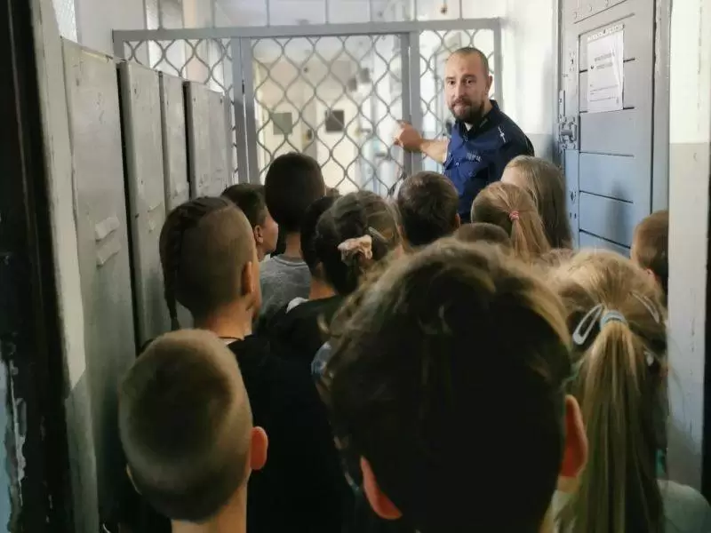 Dzieci odwiedziły jednostkę policji, gdzie miały możliwość przyjrzenia się codziennej pracy policjantów. Zwiedzanie rozpoczęto od stanowiska kierowania, gdzie dzieci zobaczyły obowiązki służby dyżurnego oraz jego zastępcy. Kolejnym punktem było zwiedzanie pomieszczenia dla osób zatrzymanych, do którego dzieci wchodziły z dużą ostrożnością jednogłośnie deklarując, że nigdy nie chciały by tam trafić.