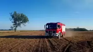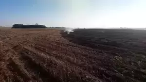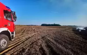 Wczoraj w Chwalimierzu kombajn zahaczył o linię energetyczną. Zerwane przewody uderzając o ziemię spowodowały iskrę i doszło do pożaru upraw rolnych.