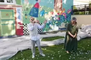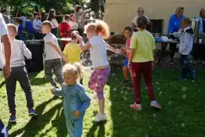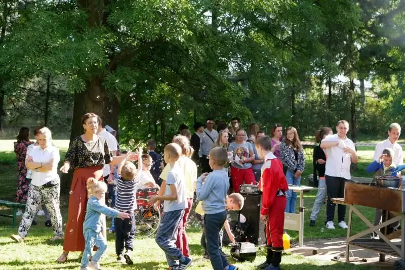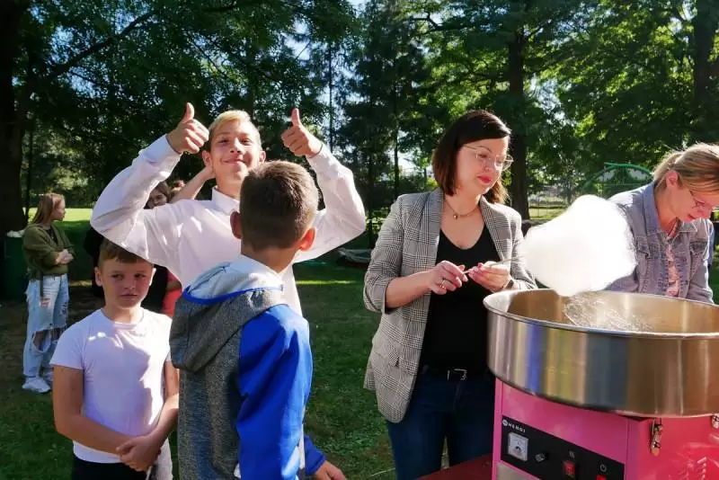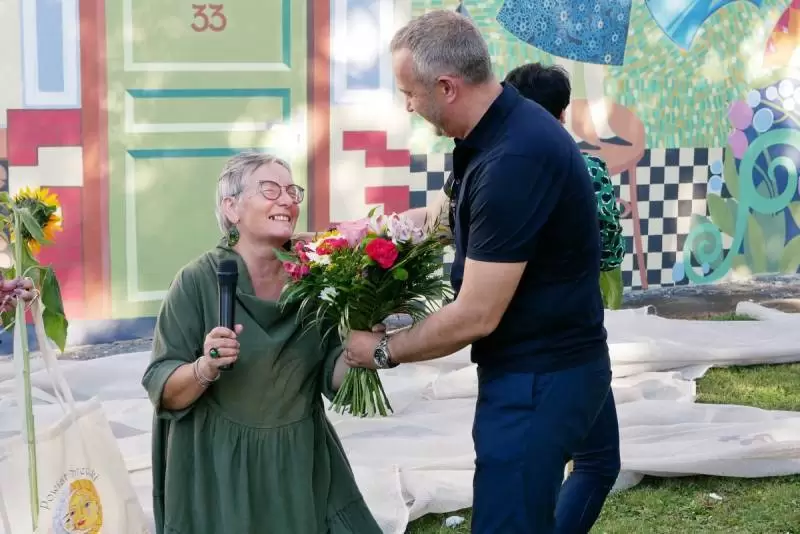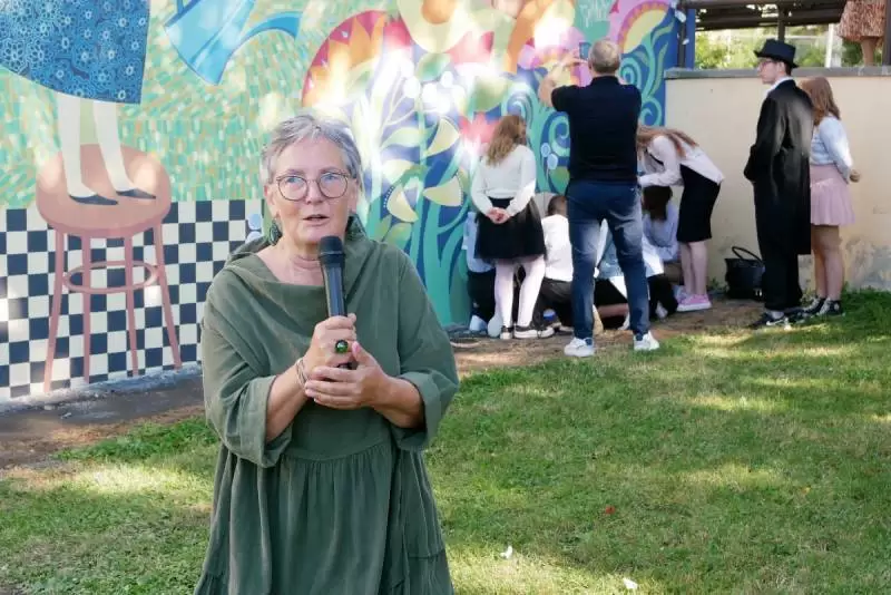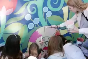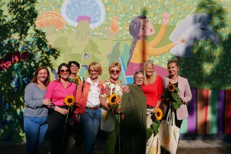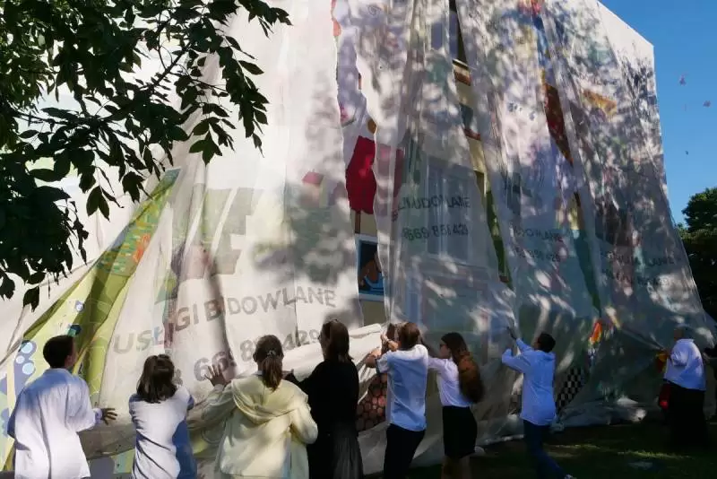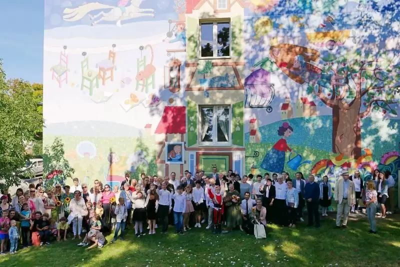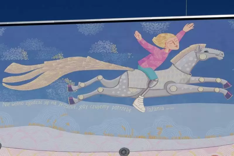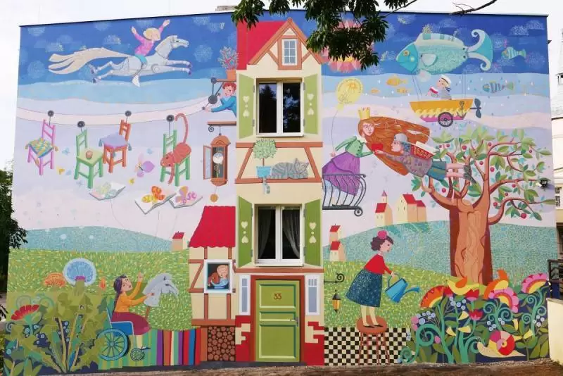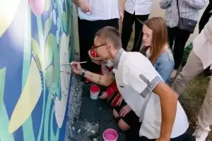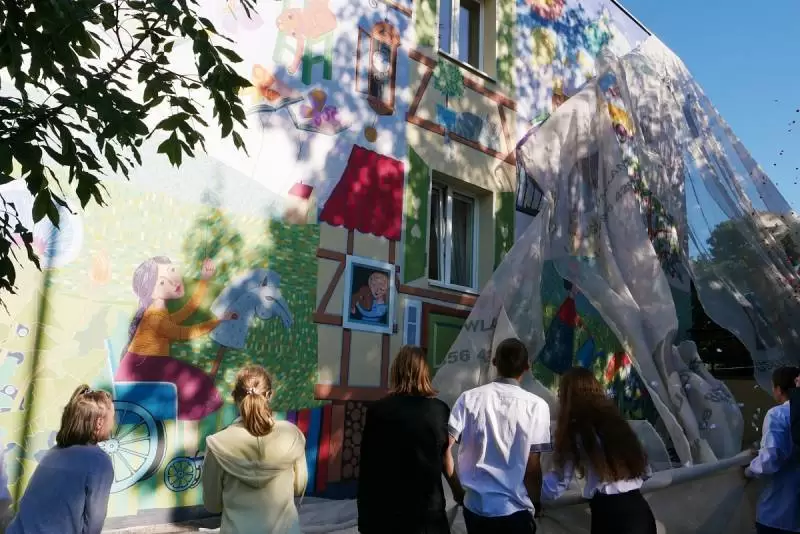 W drugiej części uroczystości zebrani udali się pod budynek, na którego ścianie powstał kolejny, piękny mural wykonany przez Małgorzatę Bogucką i jej pomocników. - Ideą muralu było pokazanie, że niepełnosprawność nie ogranicza nas w osiąganiu celów. “Nie wolno zgadzać się na pełzanie, gdy czujemy potrzebę latania” to jego hasło przewodnie. Dlatego wypatrzymy na nim dzieci i zwierzęta w bajkowej odsłonie, a także wiele innych symbolicznych elementów - wyjaśniała artystka. Oficjalnego odsłonięcia dzieła dokonały dzieci z Ośrodka, które chwilę wcześniej pokolorowały ostatni jego element.