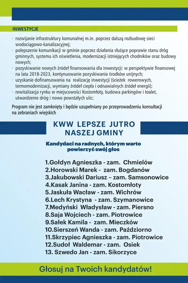 Szanowni mieszkańcy Gminy Kostomłoty! 21 października 2018 roku staniecie przed możliwością dokonania wyboru wójta i radnych naszej gminy.