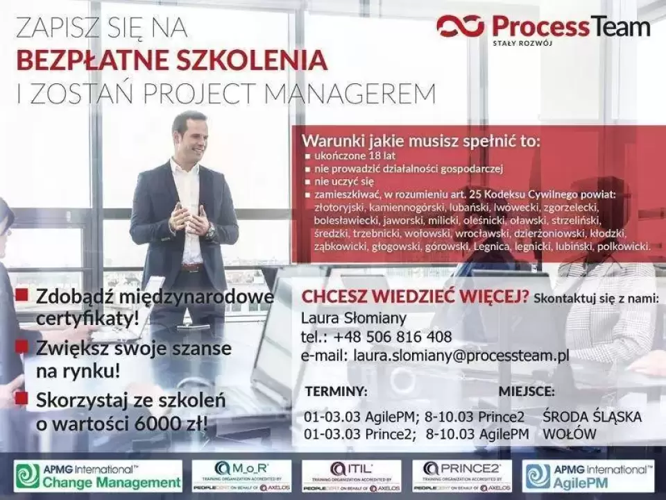 Mają Państwo możliwość wzięcia udziału w bezpłatnych szkoleniach z zakresu zarządzania projektami według międzynarodowych metodyk: Prince2 Foundation i AgilePM Foundation wraz z egzaminem.
