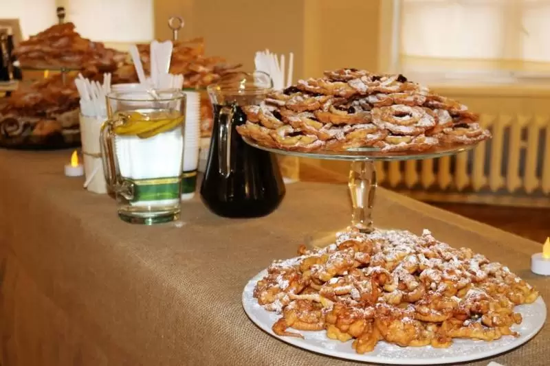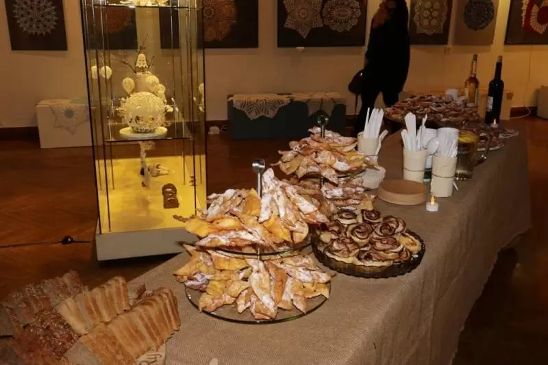 Po części teoretycznej gości zaproszono na zapustowy poczęstunek. Przygotowany stół prezentował się naprawdę wspaniale. Można była znaleźć na nim m.in. lane faworki, śledzie, róże z ciasta francuskiego, kaszę z boczkami oraz postny żurek z jajkami.
