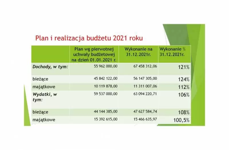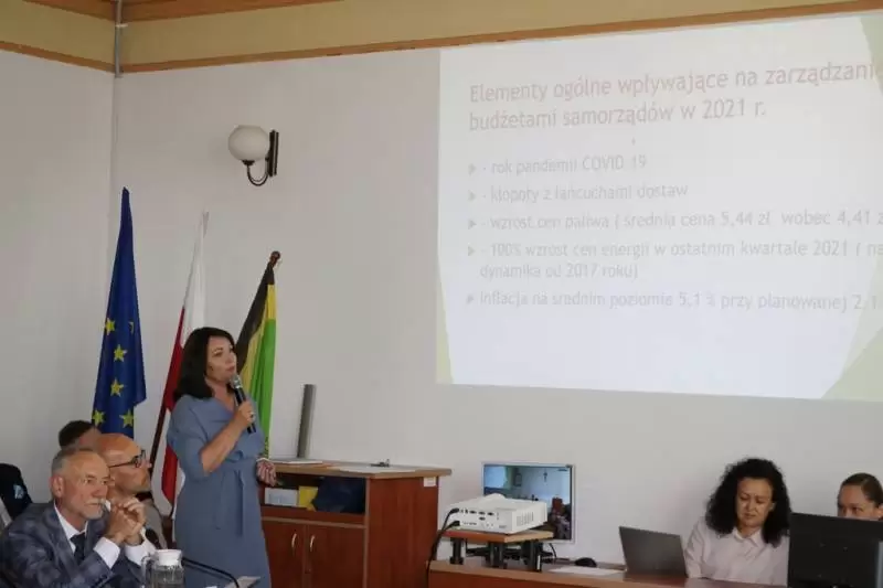 Procedura absolutoryjna rozpoczęła się od odczytania opinii Składu Orzekającego Regionalnej Izby Obrachunkowej we Wrocławiu odnośnie przedłożonego sprawozdania z wykonania budżetu powiatu za 2021 rok. Odczytała go skarbniczka powiatu Elżbieta Czarnota. Skarbniczka przedstawiła również prezentację na temat zeszłorocznych finansów. Znalazły się w niej informacje o planach i realizacji budżetu, najważniejszych inwestycjach, a także pozyskanych środkach zewnętrznych. Cechy zeszłorocznego budżetu to: wysoki poziom zrealizowanych dochodów 121%, realizacja wydatków na poziomie 106% oraz finalna nadwyżka budżetu na poziomie 4,36 mln zł.